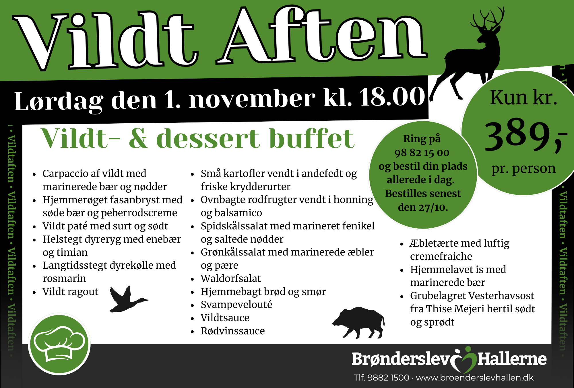 Glæd dig til en aften med vildt- og dessertbuffet fyldt med smagfulde og hjemmelavede retter. Arrangementet afholdes lørdag den 1. november kl. 18.00.